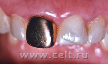 При осмотре выявлено: сквозное отверстие режущего края золотой коронки на правом верхнем центральном резце.