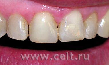 Было принято решение: для получения хорошего эстетического эффекта произвести реставрацию этого зуба и соседнего светополимеризующимися материалами.